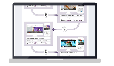 例えば、株式会社PLAN-Bが提供しているJuicerでは、ユーザーがどのような行動を取っているか、どのページがボトルネックになっているか等のデータを分かりやすく可視化してくれています。これにより、離脱率が高くユーザーの行動を妨げているページや、想定した動線とは異なるユーザーの動きを見つけた際には、A/Bテストや表示コンテンツ最適化といった改善機能を使って、改善アクションにつなげる事ができます。