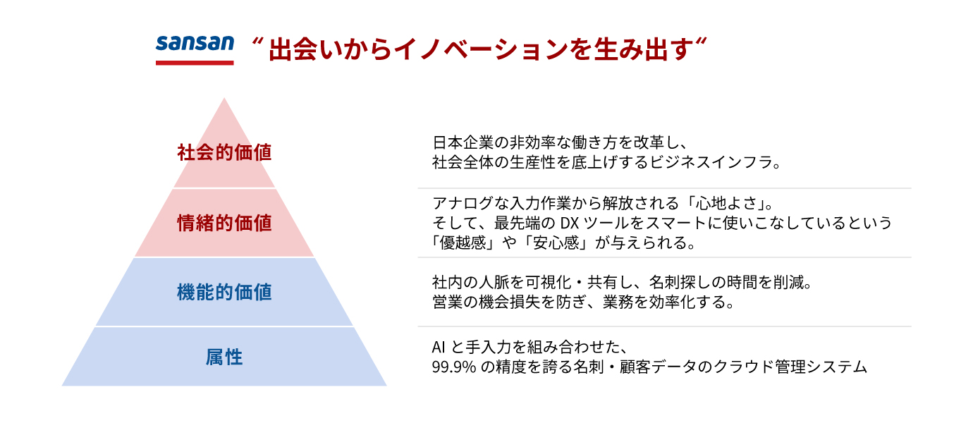 日本のBtoB企業でこれを見事に体現していると私が考える例が、営業DXサービスを提供する「Sansan」です。彼らの提供価値をピラミッドの階層に当てはめると、以下のようになります。